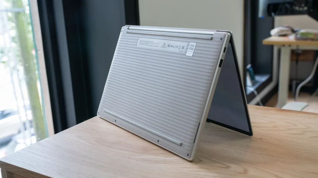 Realizzato principalmente in alluminio polverizzato, il design del Chromebook Plus 14 può sembrare semplice, ma cela una notevole solidità. La struttura presenta poco o nessun flex, conferendo al dispositivo una sensazione di robustezza e qualità.
